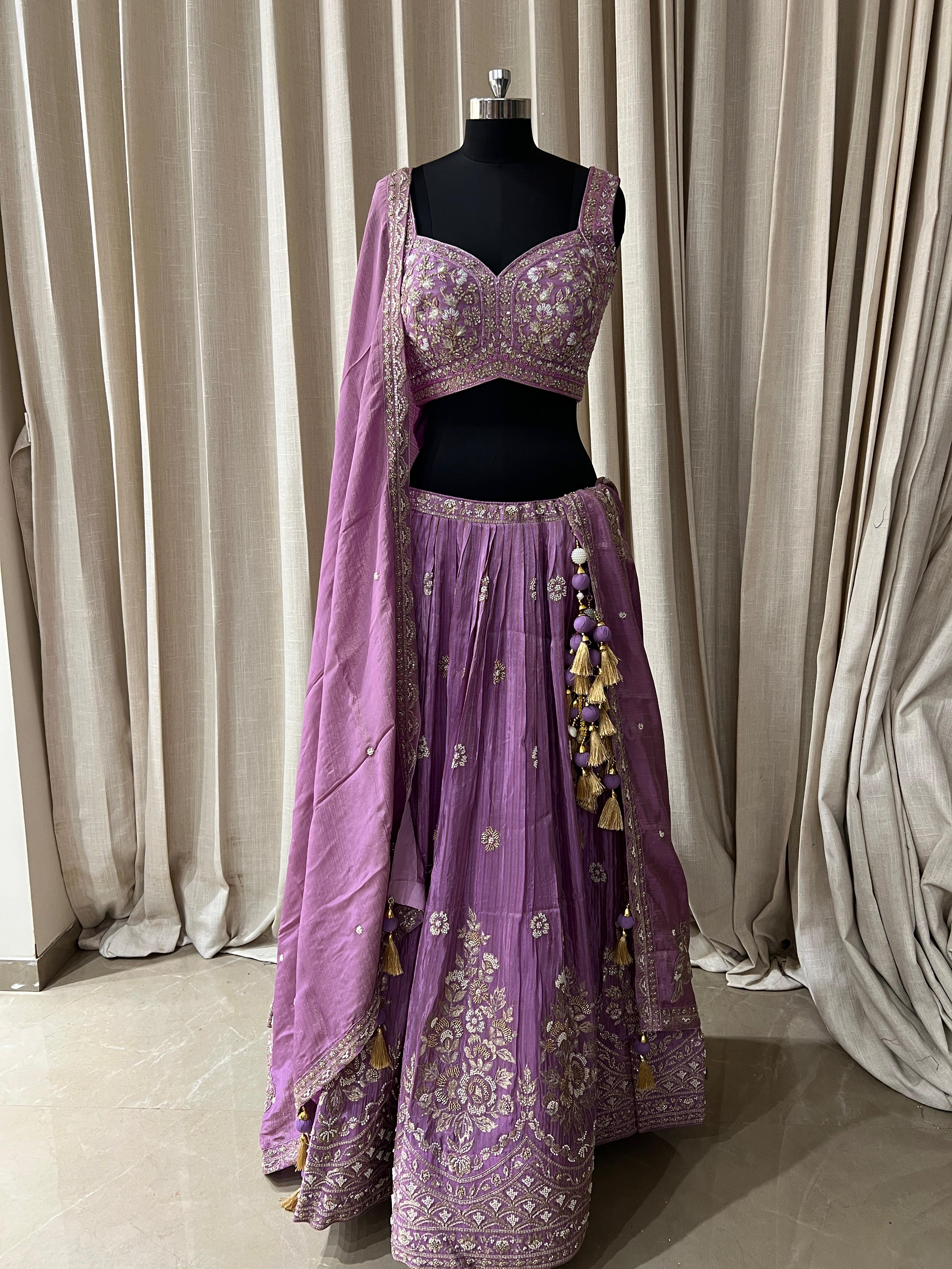 Lavender Embroidered Lehenga Choli with Mirror and Tassel Detailing Description: