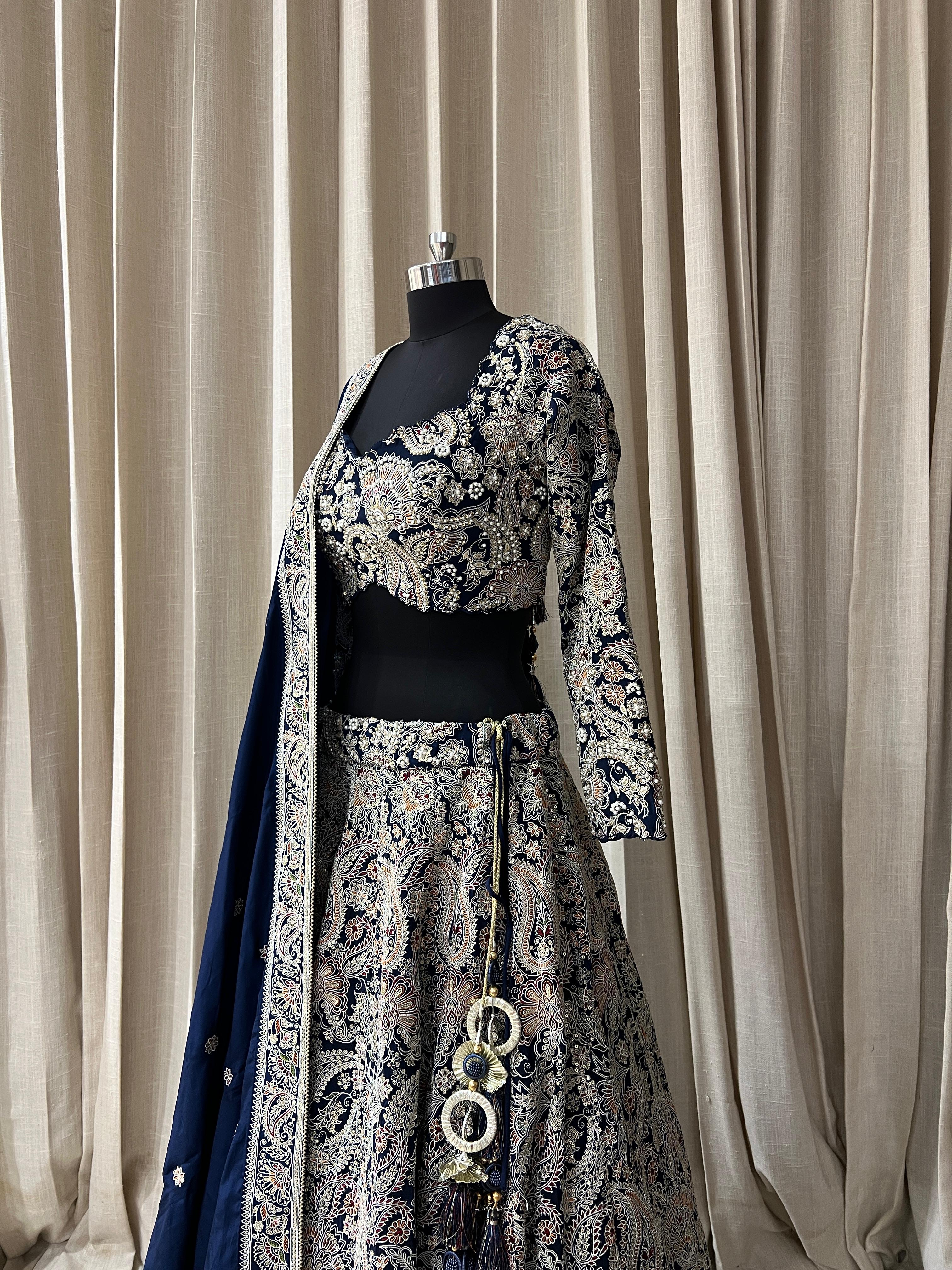 Navy Blue and Silver Embroidered Kashmiri Work Lehenga Choli