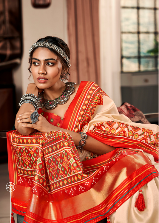 Cream & Red Patola Printed Tussar Silk Saree