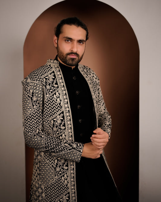 Black Velvet Indo Western with Silver Embroidered Jacket
