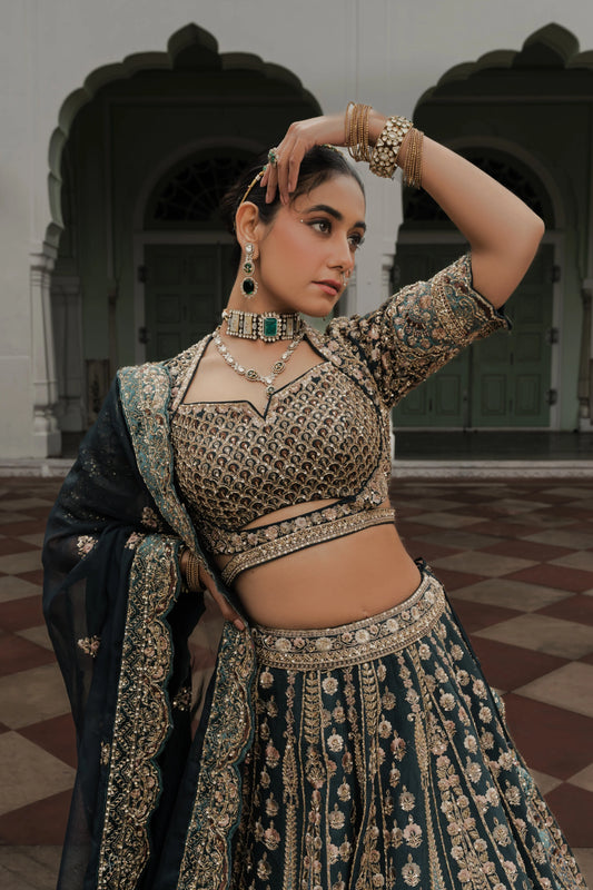 Saga Green Raw Silk Lehenga with Zardosi & Sequin EmbroideryRegular price Rs. 79,999.00Regular priceUnit price / per-