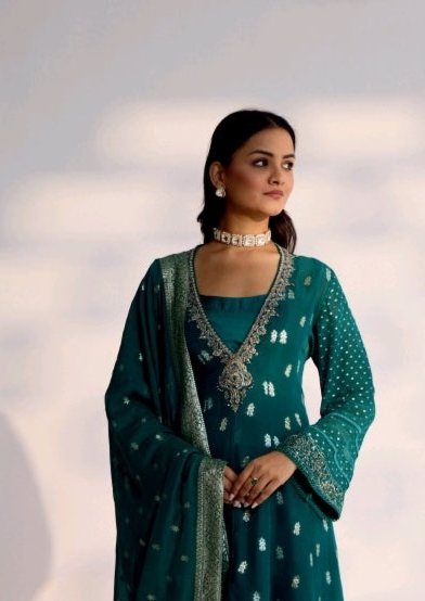 Teal Blue Sequin Embellished Lehenga Set with Net Dupatta