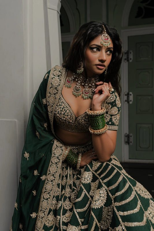Dark Green Raw Silk Lehenga with Gold Zardosi Embroidery