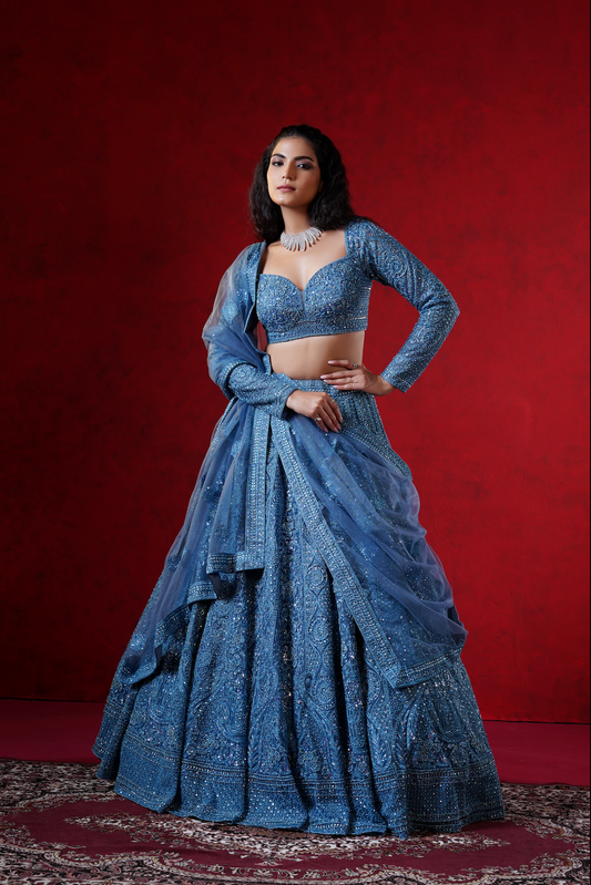 Ink Blue Net Designer Lehenga with Sequins & Embroidery