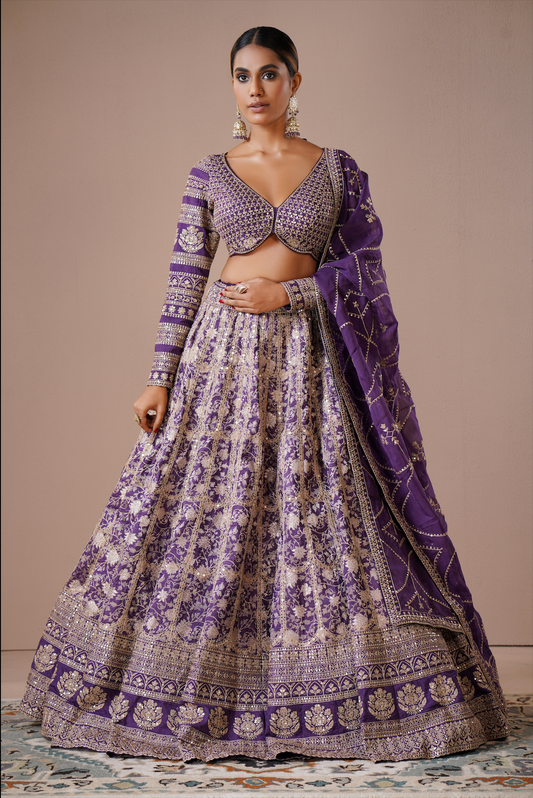 Purple Zardosi Embroidered Crepe Reception Lehenga