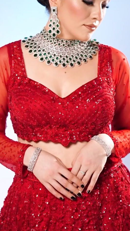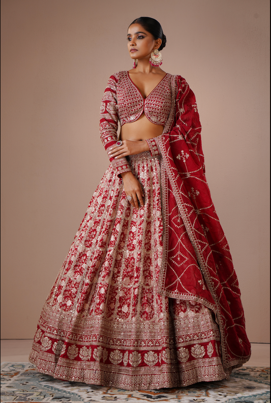 Ruby Red Silk Bridal Lehenga with Sequins & Zari Embroidery