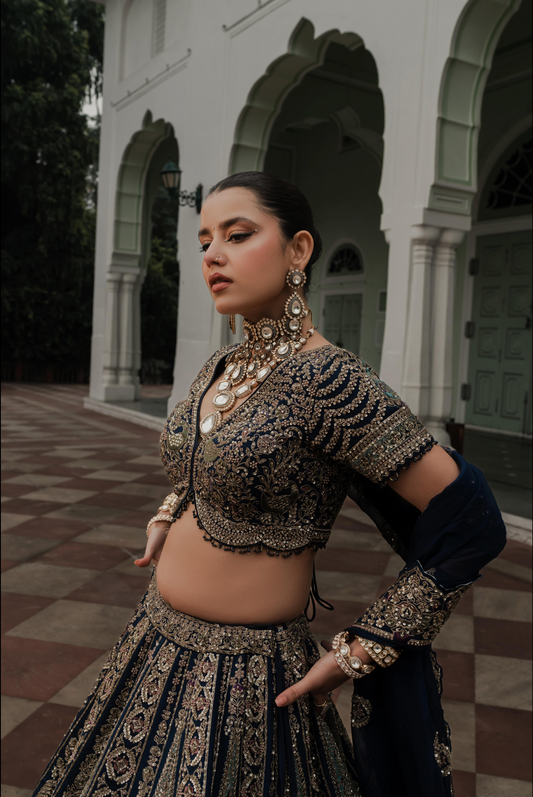 Zariah Teal Blue Velvet Zardosi Lehenga