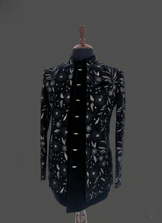 Black Velvet Indo Western Suit with Heavy Floral Embroidery