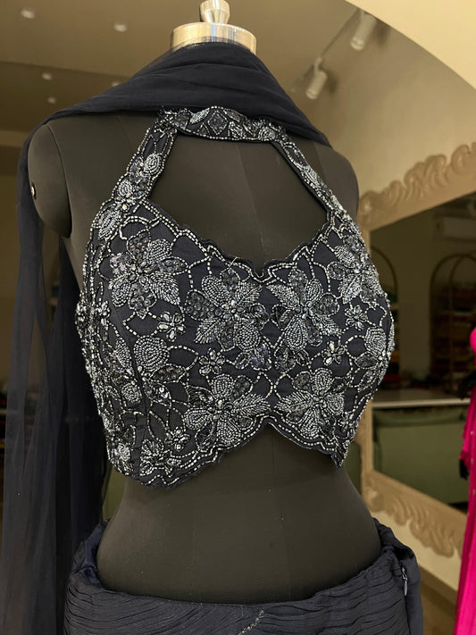 Navy Blue Embellished Crop Top with Tiered Pleated Skirt