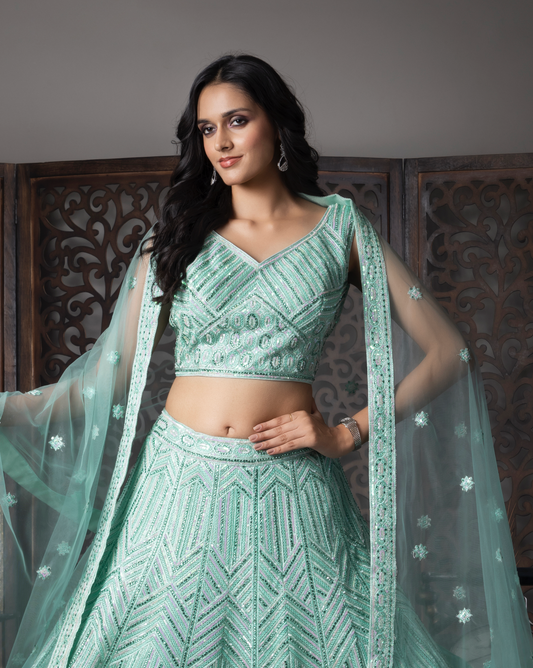 Ivory Lehenga with Sky Blue and Green Accents
