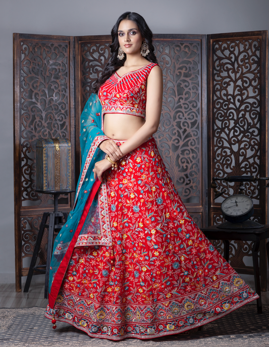 Red & Blue Flora Embroidered Lehenga Choli