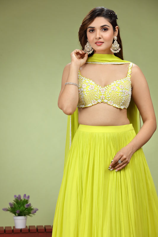 Lemon Yellow Lehenga Set With Floral Pearl Hand Embroidered Blouse