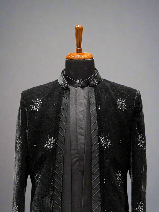 Black Velvet Indo-Western Set with Crystal Motif Detailing