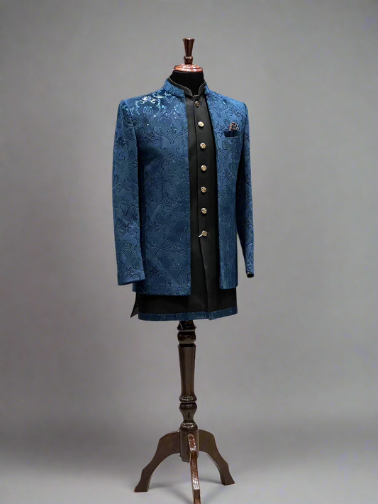 Teal Blue Textured Indo-Western with Antique Gold Buttons