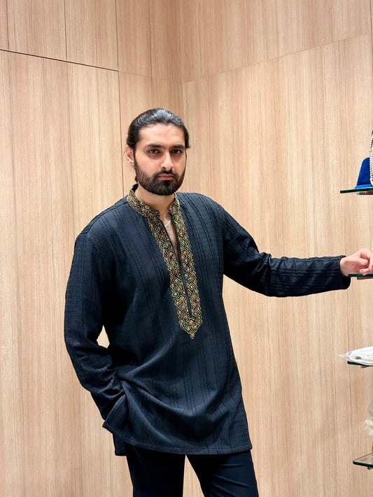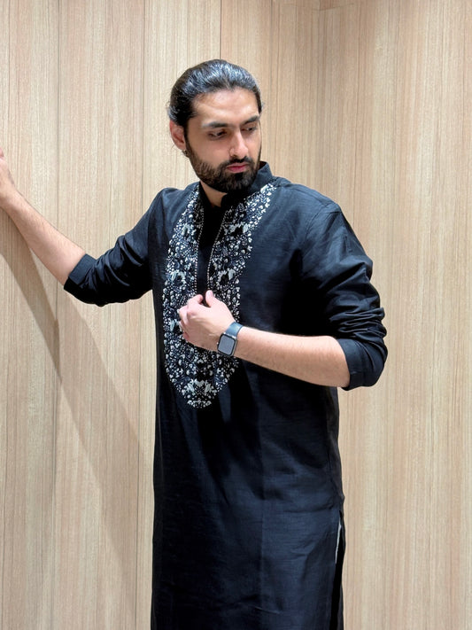 Black Embroidered Kurta with White Pajama and Thread Work Detailing