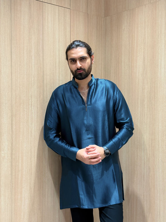 Blue Silk-Blend Kurta Pajama and Subtle Striped Texture
