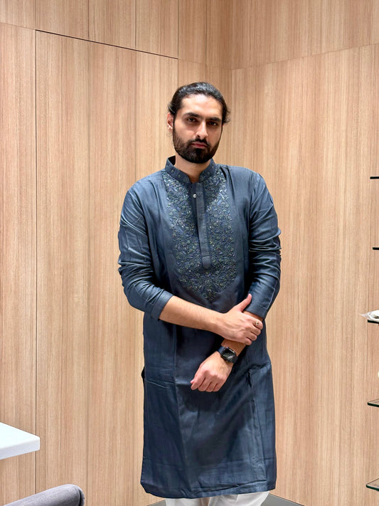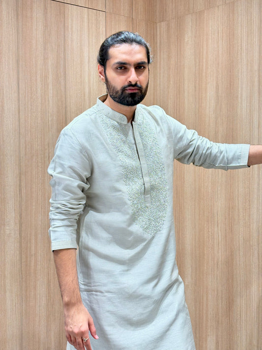 Light Blue Embroidered Silk Kurta with Mirror Work Detailing