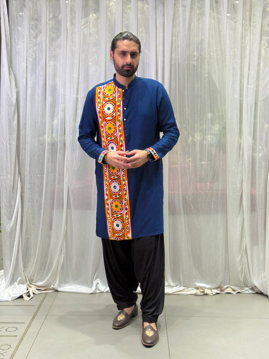 Navy Blue Kutchi Embroidered Cotton Kurta