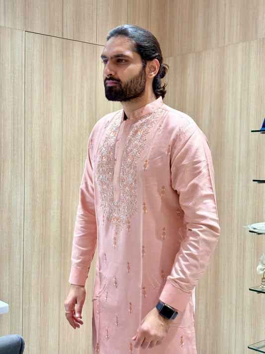 Peach Embroidered Kurta with White Pajama and Delicate Thread Work