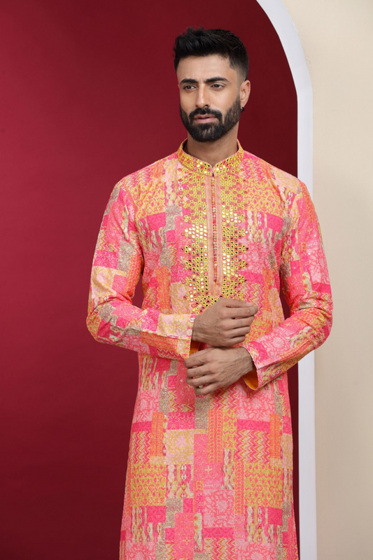 Pink Mirror Work & Printed Kurta Set