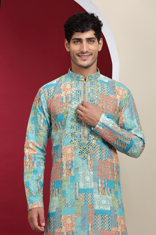 Sky Blue Mirror Work & Printed Kurta Set