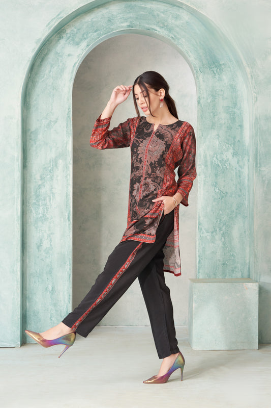 Black & Maroon Printed Kurta Set with Trousers – Contemporary Fit