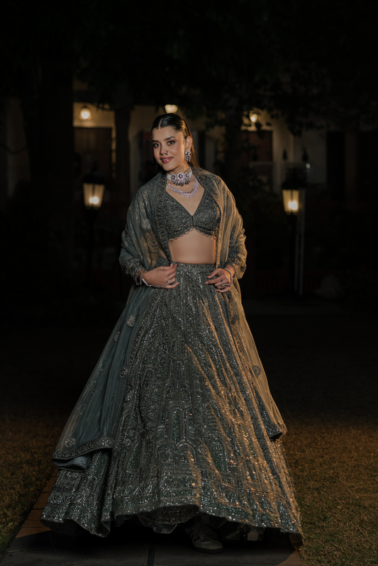 Green Crepe Lehenga with Intricate Zardosi Embroidery
