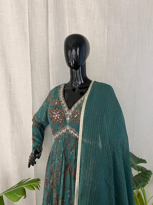 Teal Floral Anarkali with Sequins & Gota Detailing
