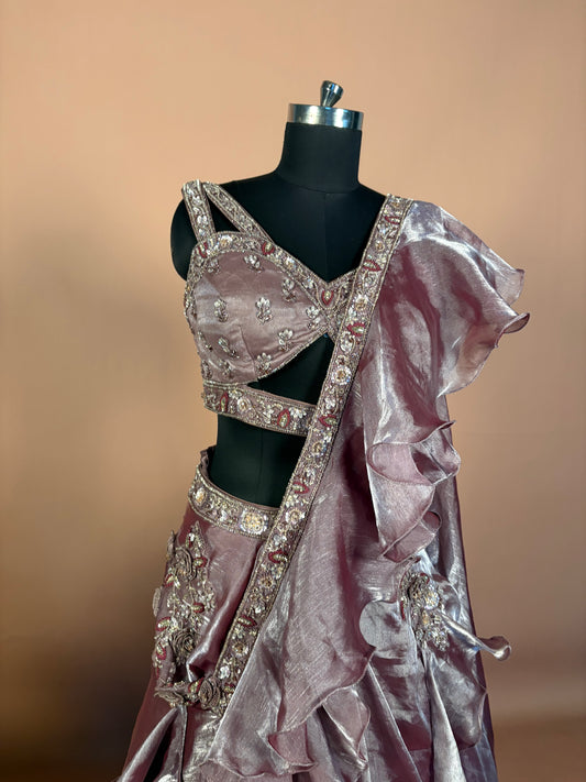 Mauve Metallic Ruffle Lehenga Set with Cutout Blouse
