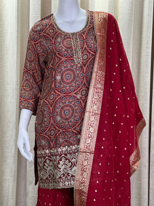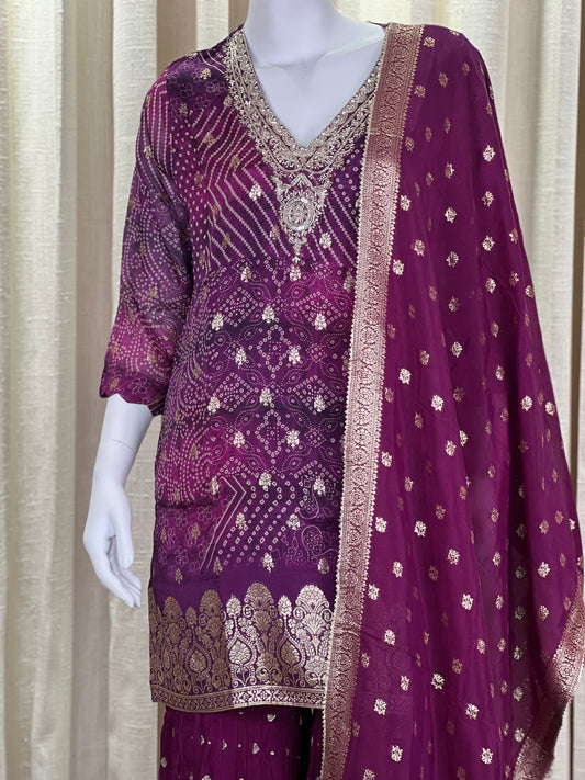 Maroon Bandhani Sharara Suit with Mirror & Zari Work