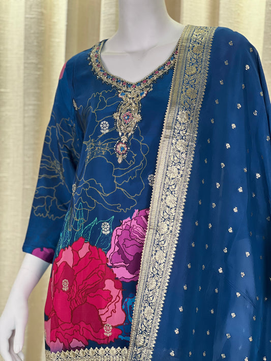 Royal Blue Floral Sharara Suit with Embellished Dupatta & Intricate Embroidery