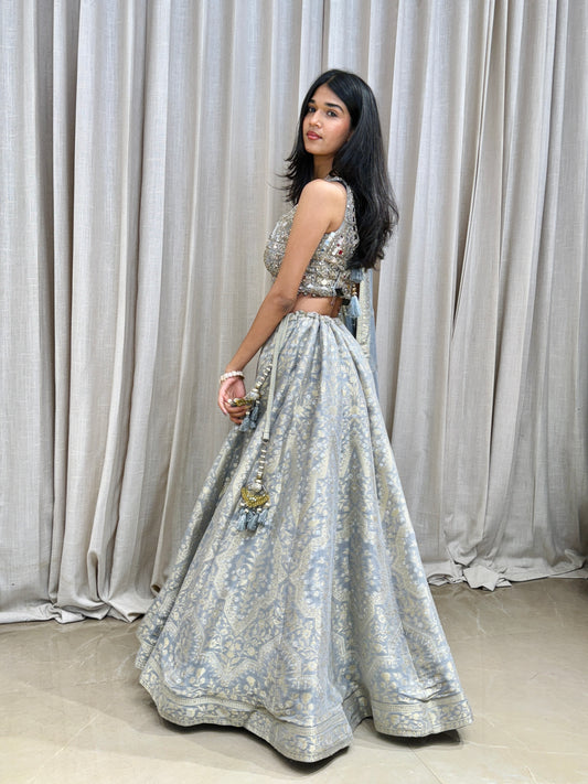 Dusty Blue Embroidered Silk Lehenga Set with Mirror Work Blouse