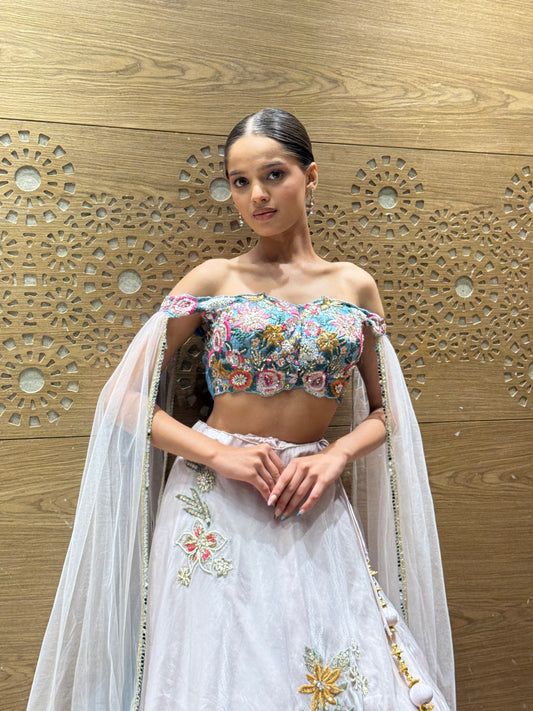 Icy Lavender Floral Embroidered Lehenga Set with Cape Sleeves