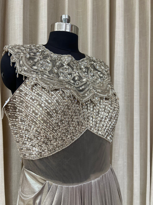 Silver Grey Designer Gown with Heavy Embroidered Bodice and Pleated Drape Skirt
