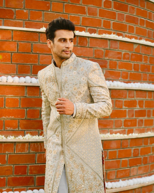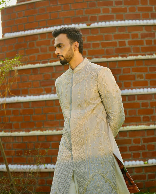 Ivory Mirror & Zari Embroidered Royal Sherwani