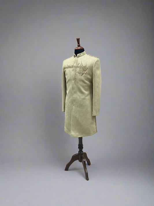 Pastel Green Suede Sherwani with Hand Embroidered Shoulder Motif