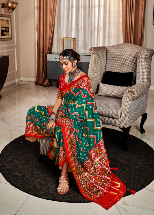 Red and Yellow Elora Ajrak Printed Patola Saree