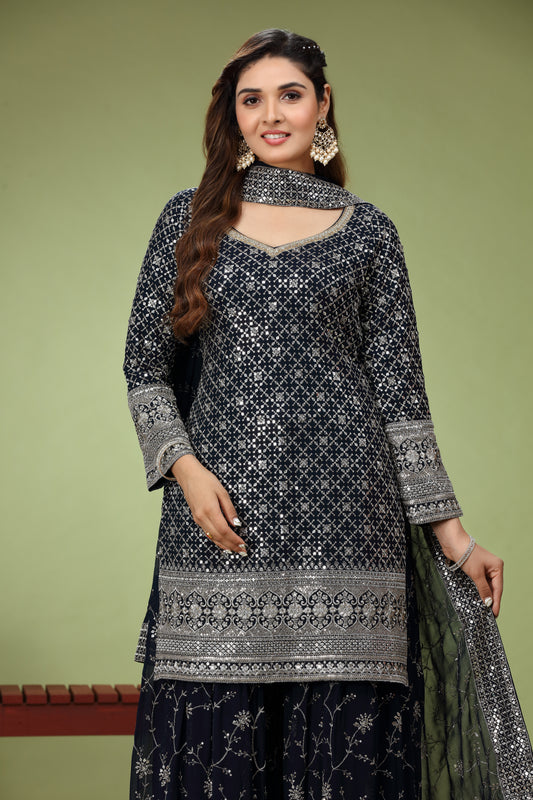 Navy Blue Embroidered Patiala Kurti and Sharara set