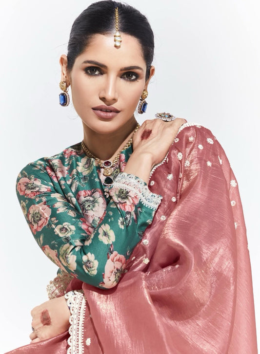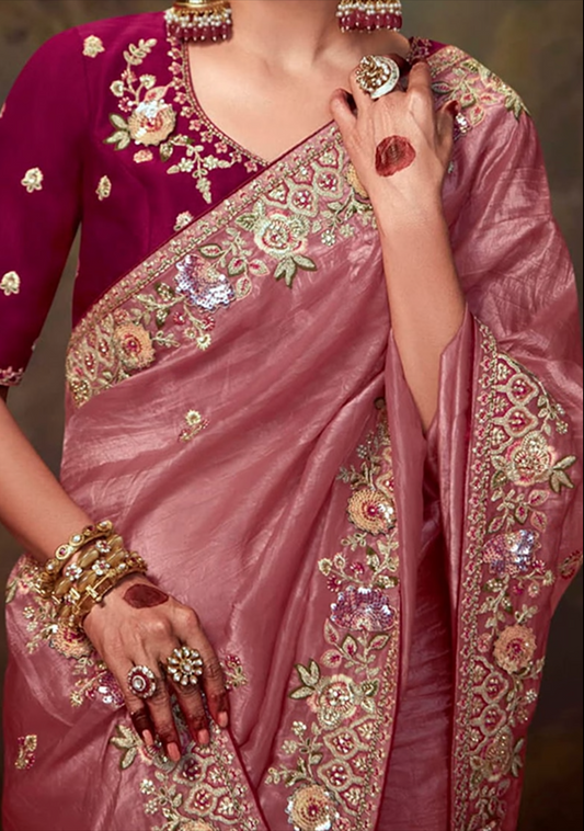 Pink Organza Saree with Multicolor Satin Silk Blouse for Party Wear