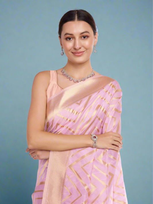 Pink Blended Floral Woven Saree with Contrast Border