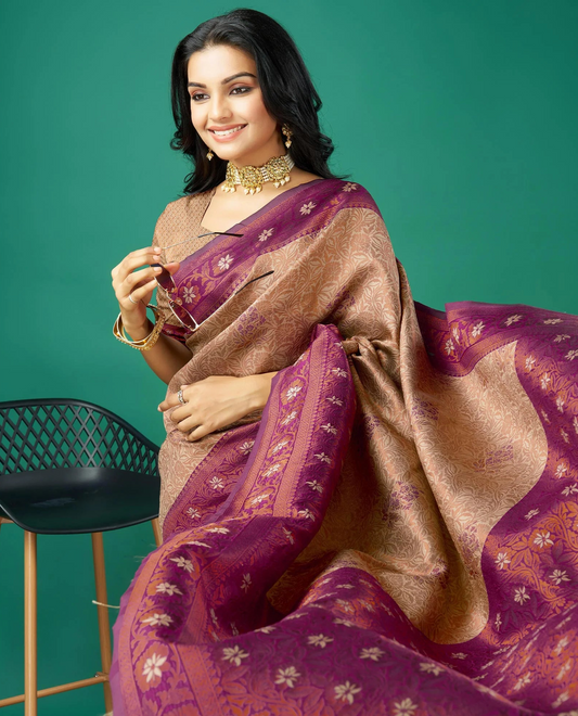 Chikoo Zari Woven Banarasi Silk Saree with Tassels