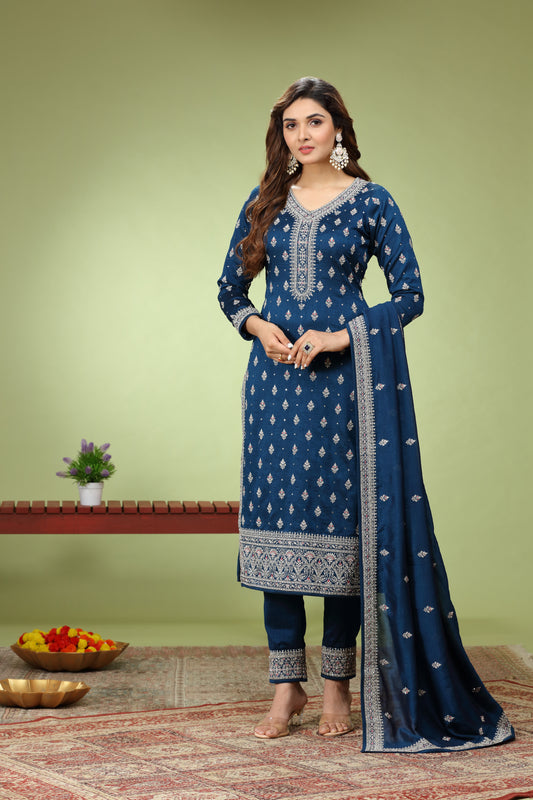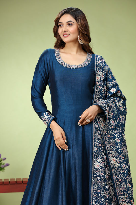 Dark Blue Anarkali Set With Flora Embroidery work Dupatta
