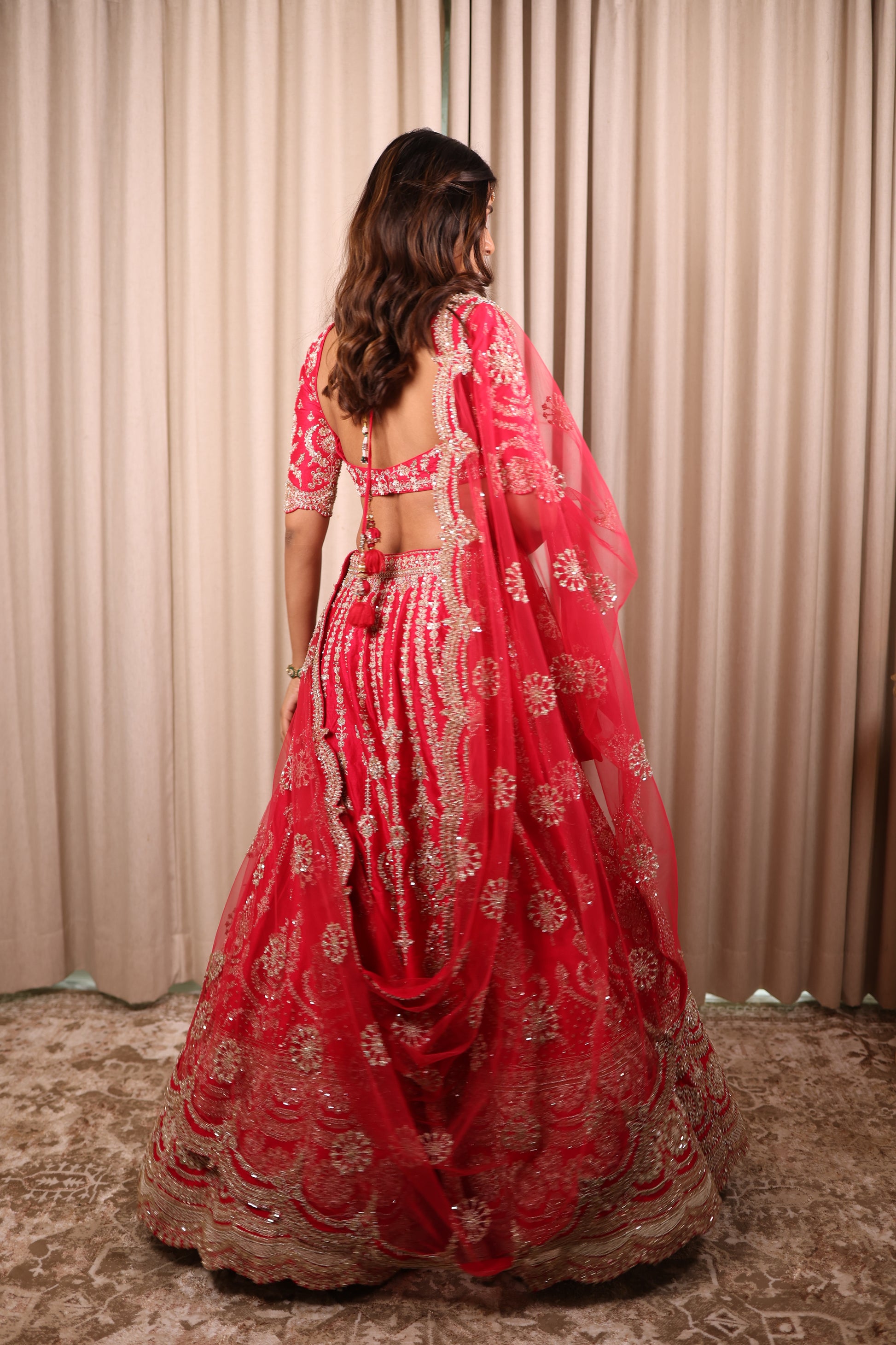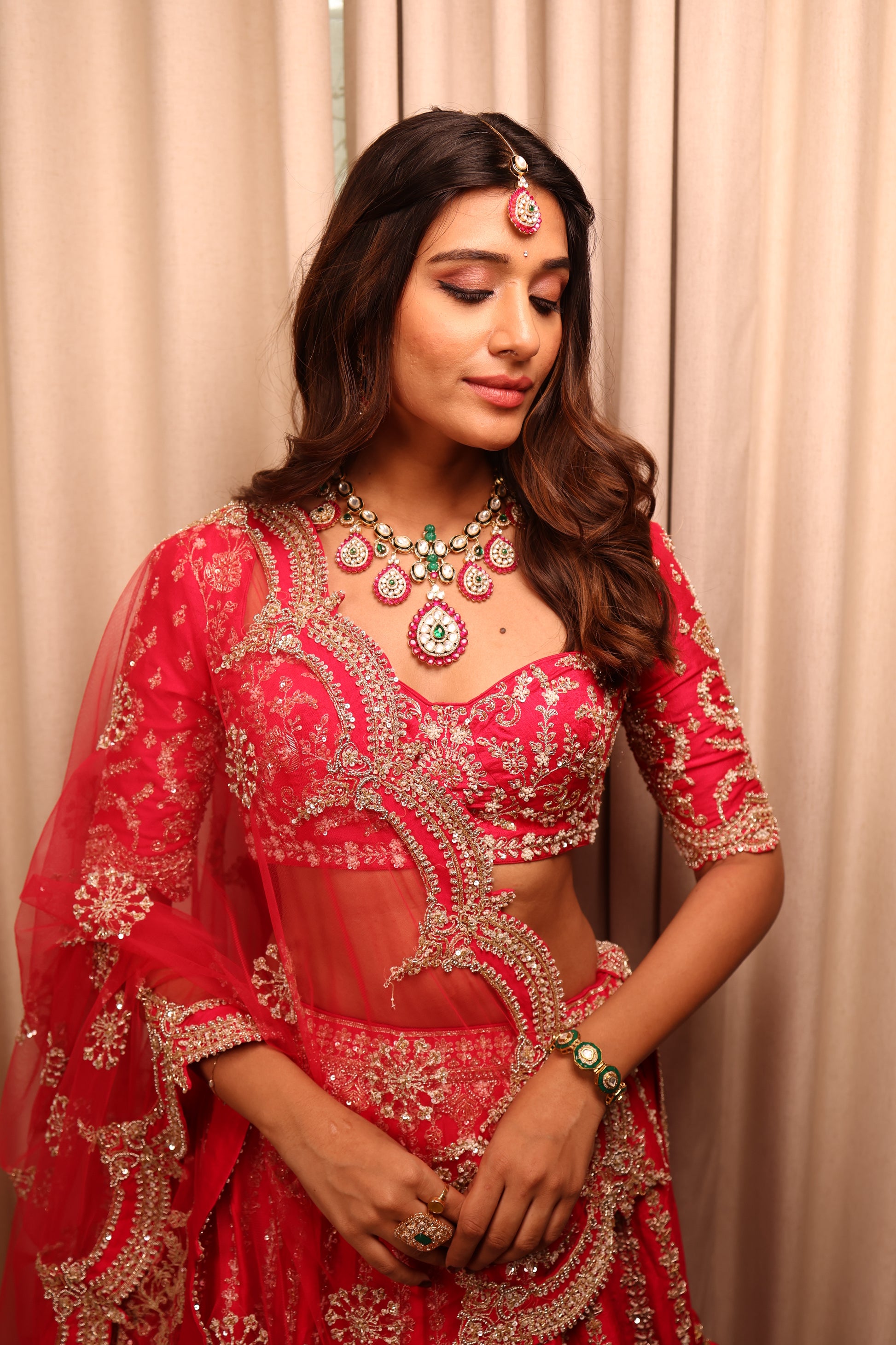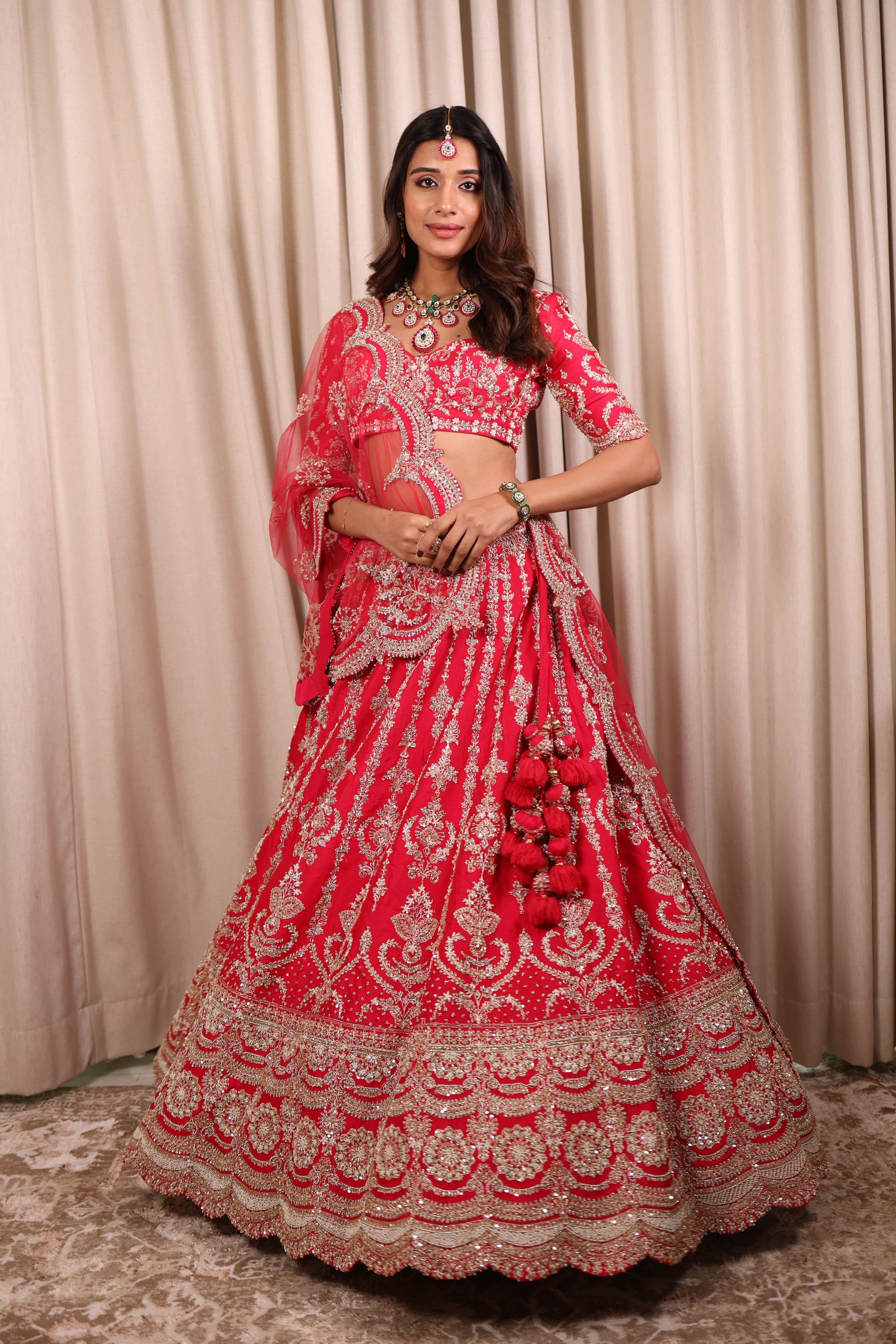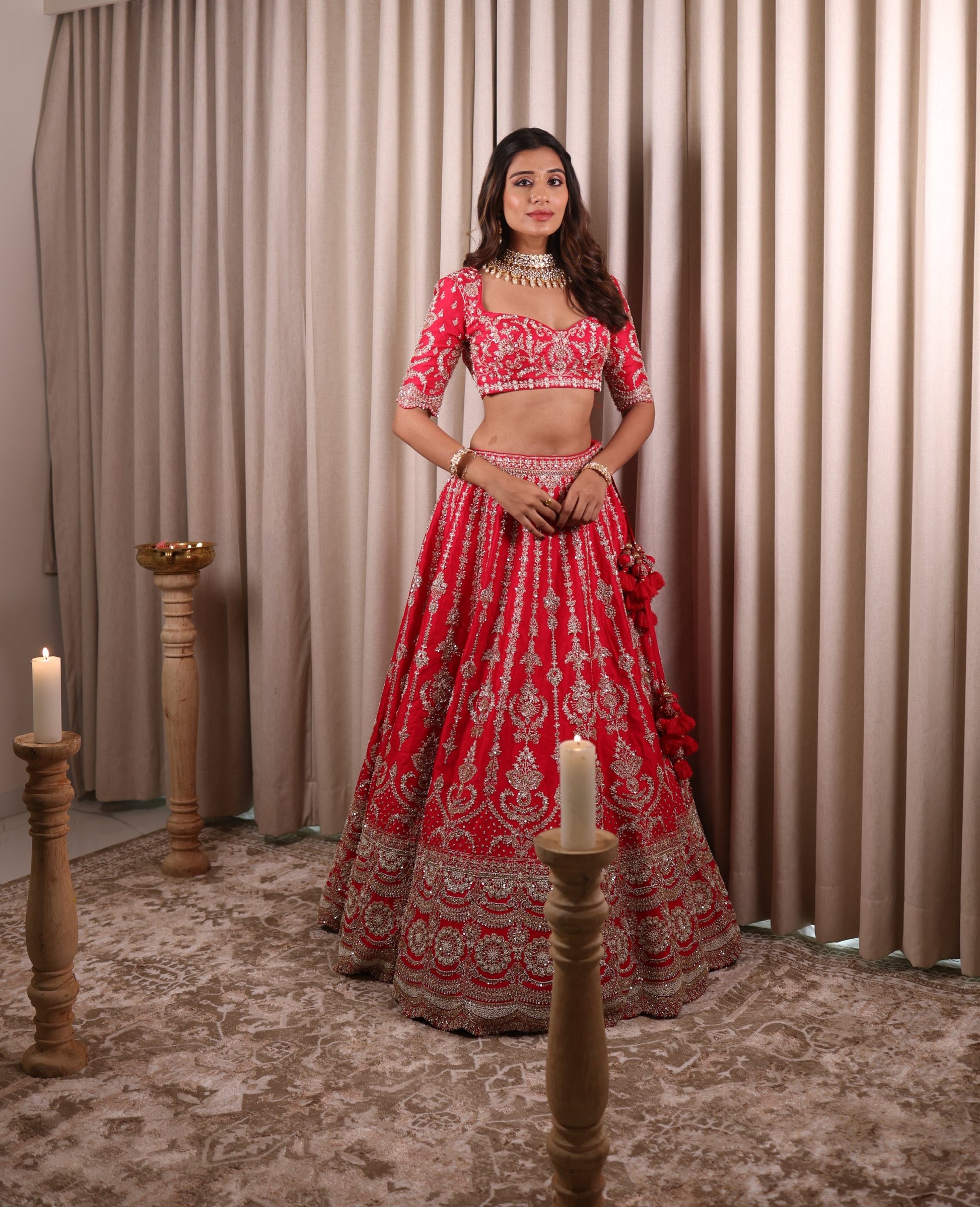 Get ready to stun on your special day with our Beery Red Bridal Lehnga Choli! This stunning outfit features a deep red color and intricate embroidery, making you the center of attention. Dance the night away in this comfortable and stylish lehenga, perfect for your dream wedding.