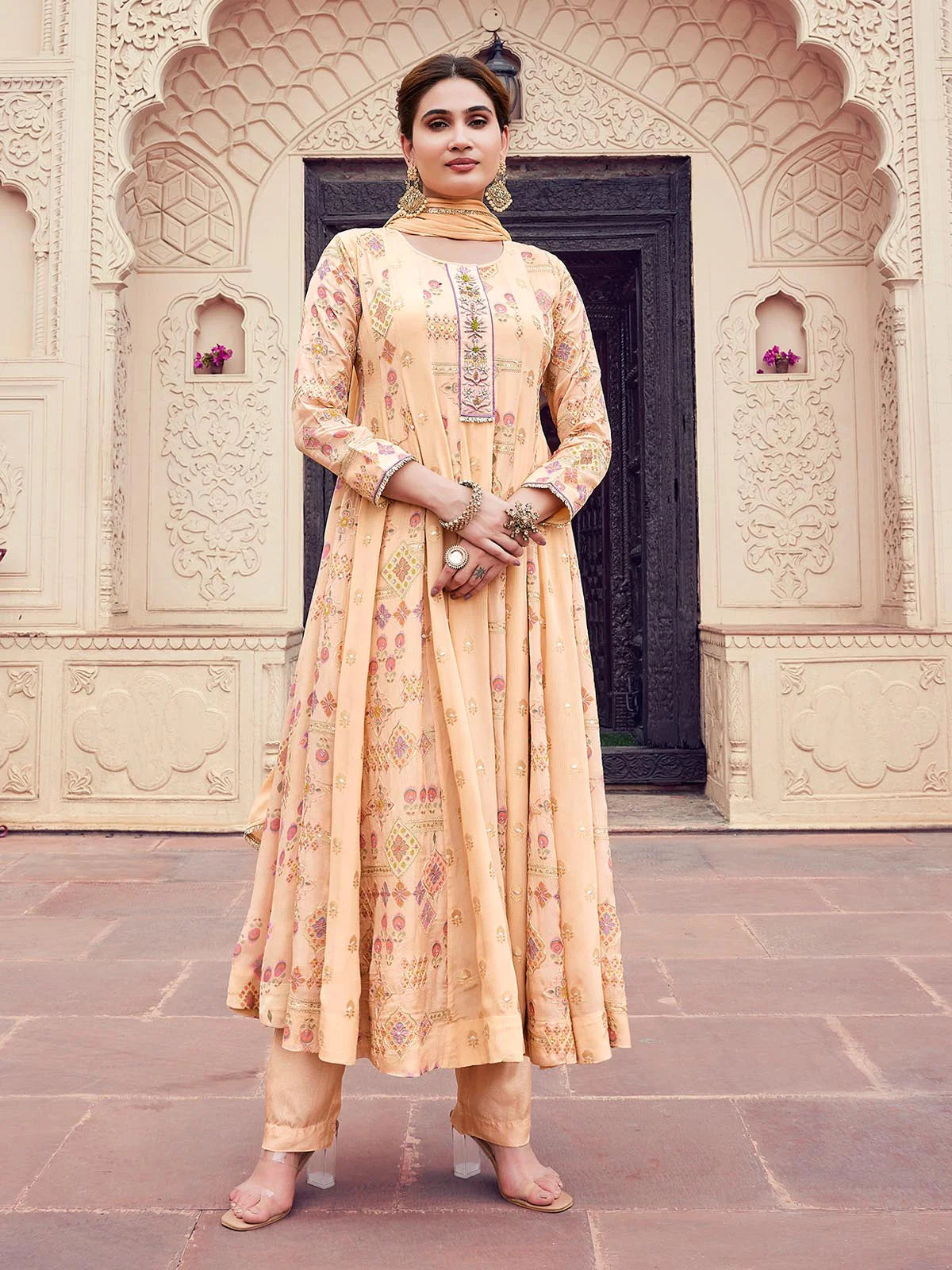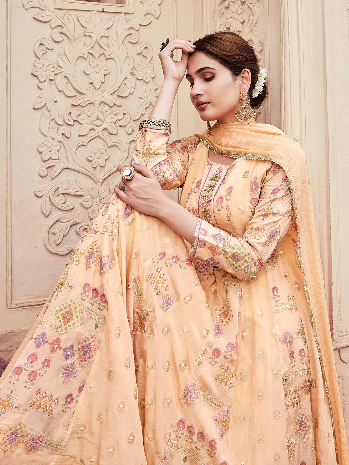 Embodying the spirit of the festive season, she twirls in a breathtaking beige jacquard anarkali, each kali intricately designed with floral and jacquard motifs. The exquisite zardosi floral embroidery on the yoke and sleeves adds a touch of elegance. Paired with beige silk pants and a chiffon dupatta adorned with laces and tassels, this ensemble is ideal for a sophisticated day-time celebration.