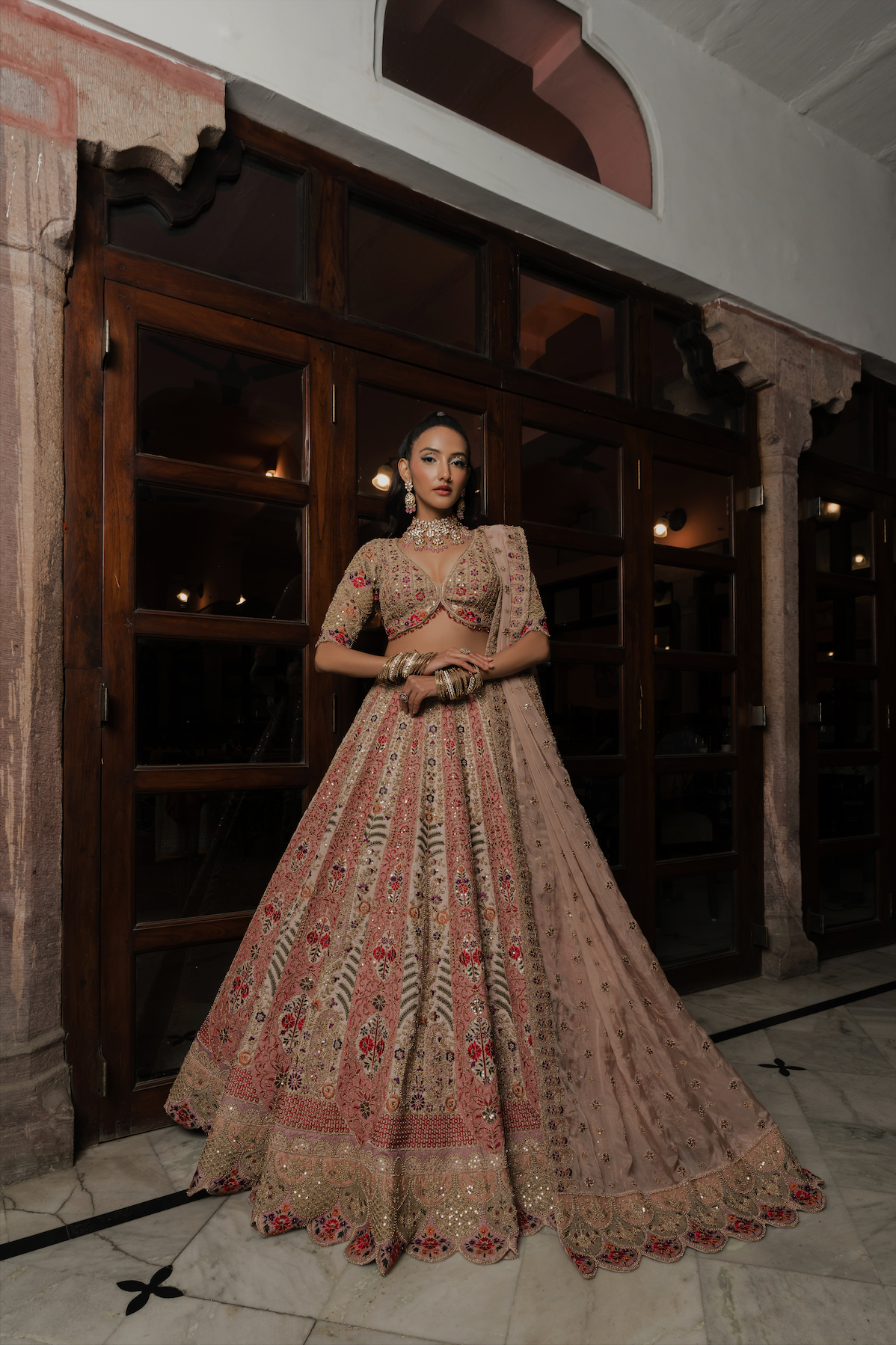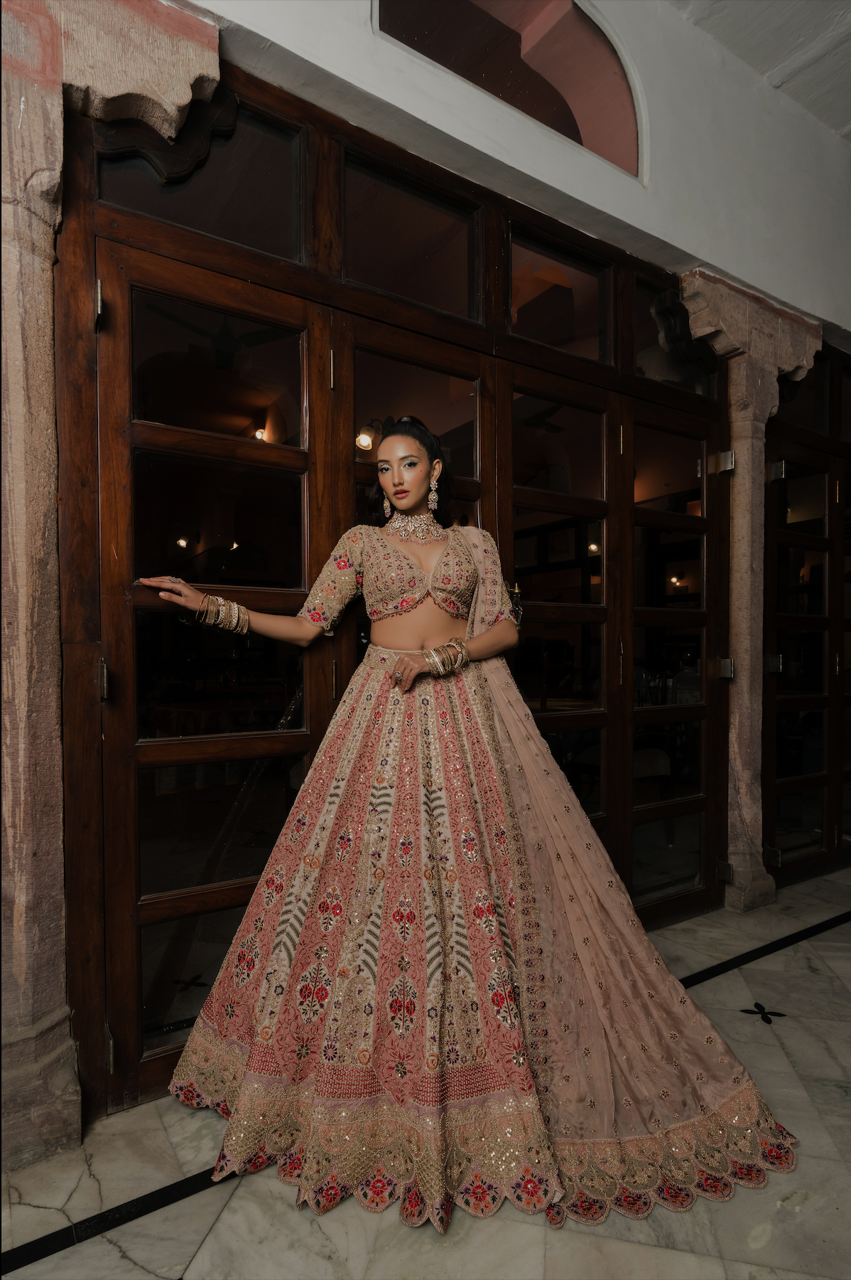 Exude timeless elegance in this beige flared lehenga crafted from pure silk. The ensemble is beautifully adorned with resham, bead, sequins, and zari embroidery, adding rich texture and graceful detail. Paired with a readymade V-neck blouse featuring elegant elbow sleeves and a soft organza dupatta with matching embroidery, this look is perfect for graceful festive or wedding occasions.