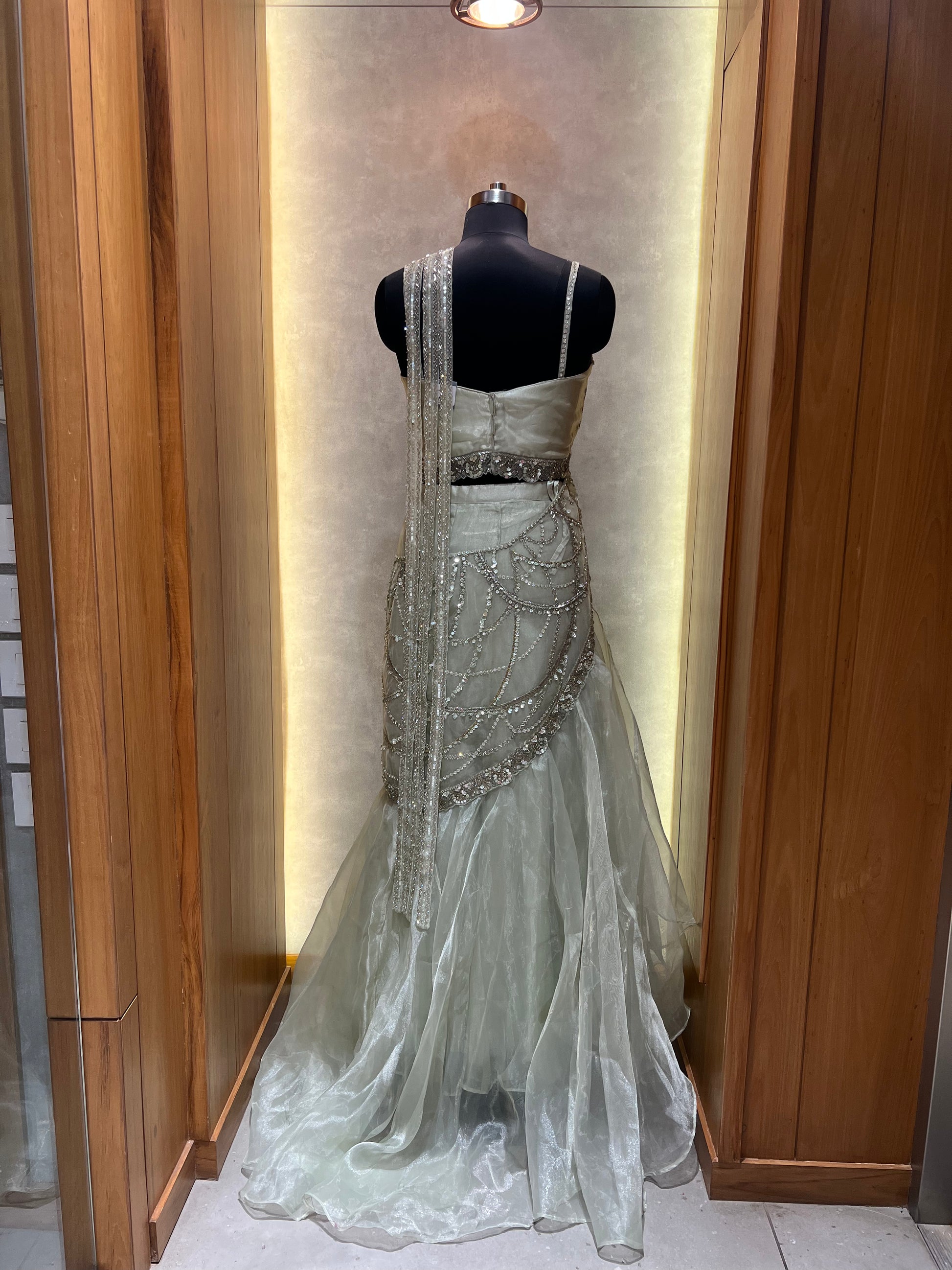 Benzer Pista Green Stone Sequins Ghagra Saree Indo Western