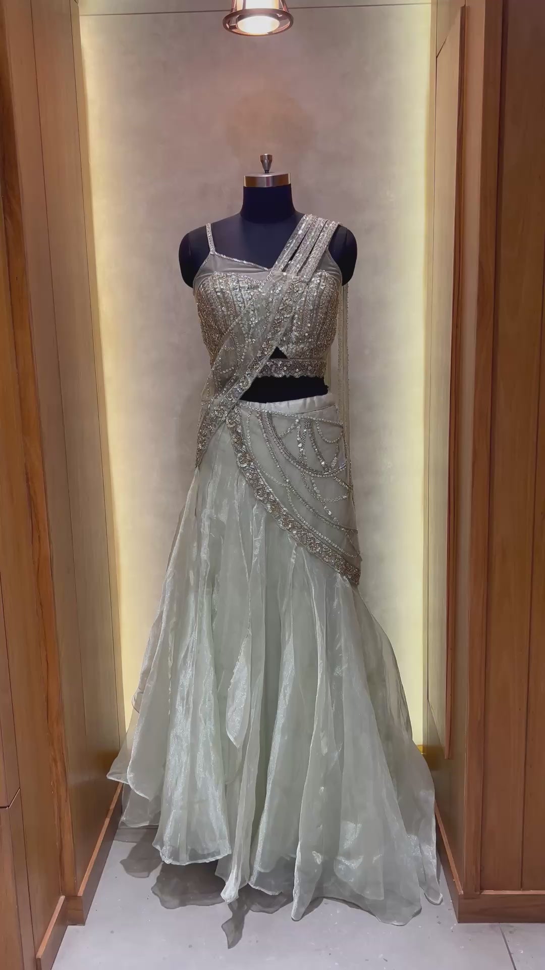 Embrace traditional and modern styles with the Benzer Pista Green Stone Sequins Ghagra Saree Indo Western. Dazzling sequins and vibrant green stones add a touch of glamour to this unique ensemble. Perfect for any occasion, dress to impress with this one-of-a-kind saree.
