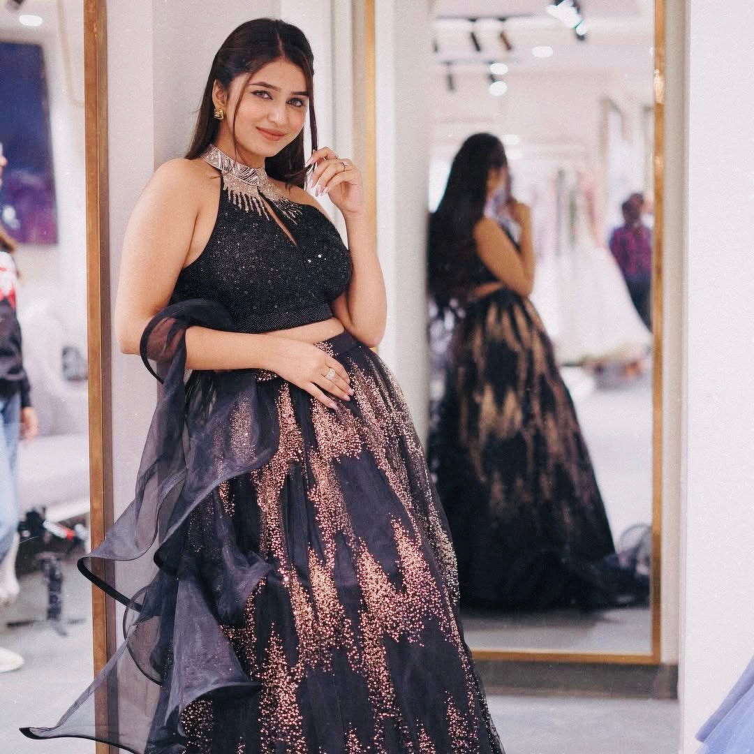 Twirl and shimmer in this Black & Rose Gold Lehenga Choli, a fusion of traditional and modern design. Perfect for parties, weddings, and fashion shoots, its bold neckline adds a touch of western elegance to the classic ethnic style. Stand out and make a statement with this unique twist on Indian traditional wear.