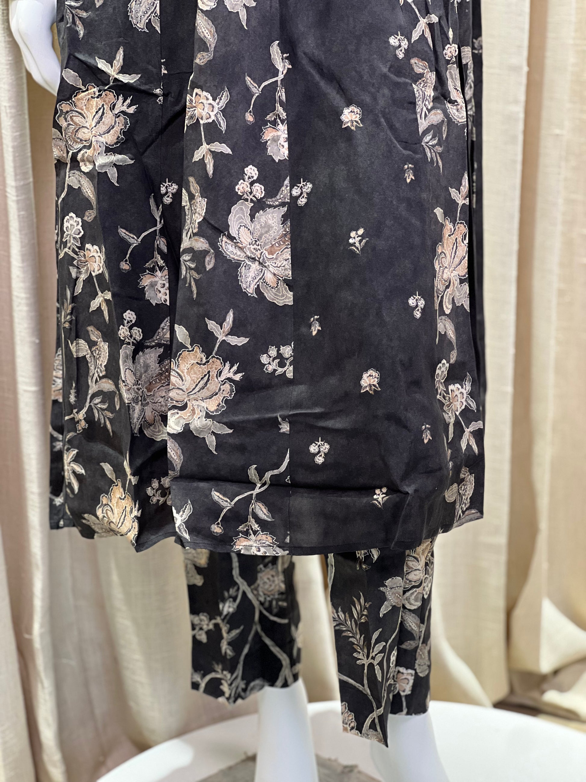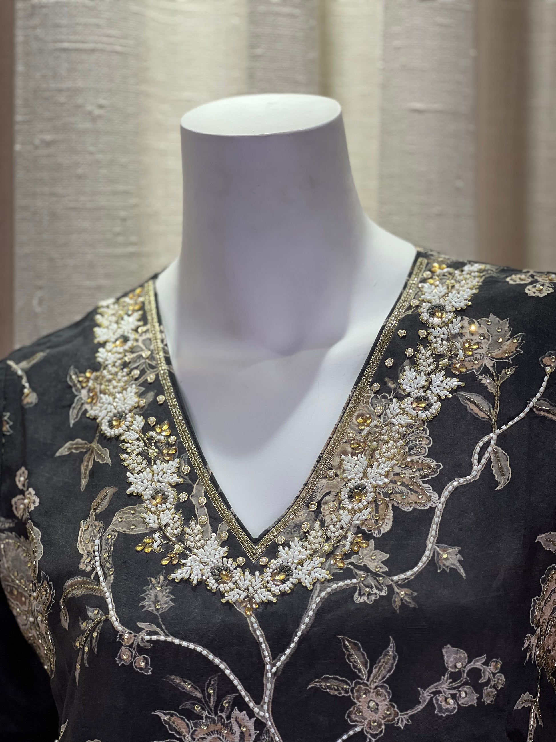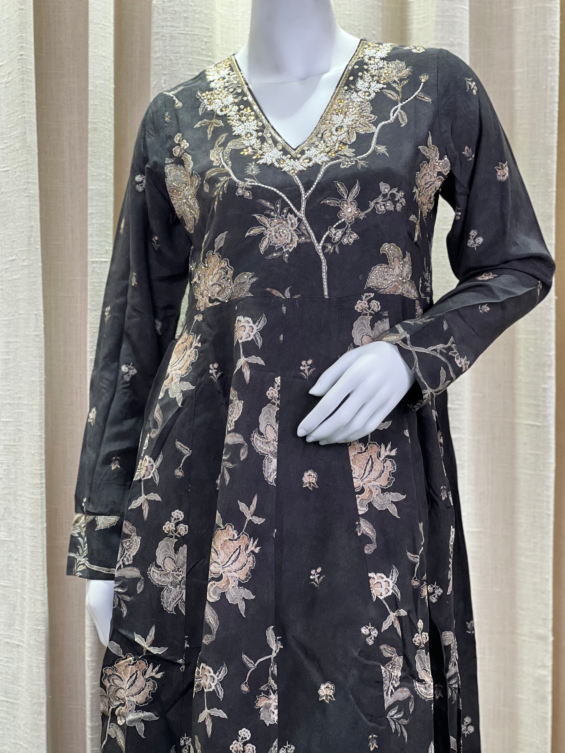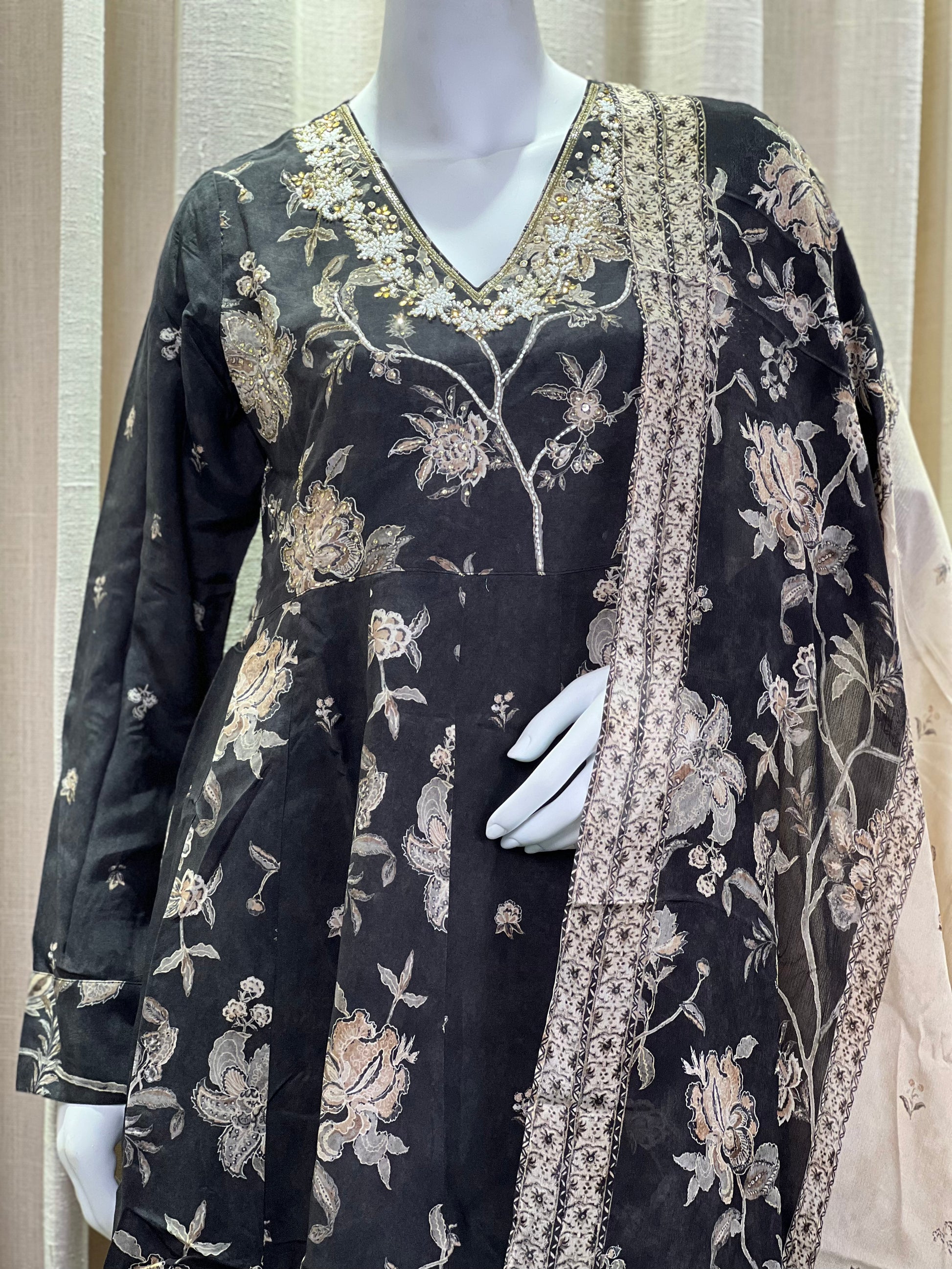 Grace meets grandeur in this exquisitely crafted Anarkali suit set. Made from premium fabric, the deep black base is beautifully contrasted with beige and gold-toned floral embroidery, adding a regal touch to the outfit. The kurta features a classic V-neckline with delicate zari work along the borders, full sleeves with subtle embellishments, and a flared silhouette for a royal drape.