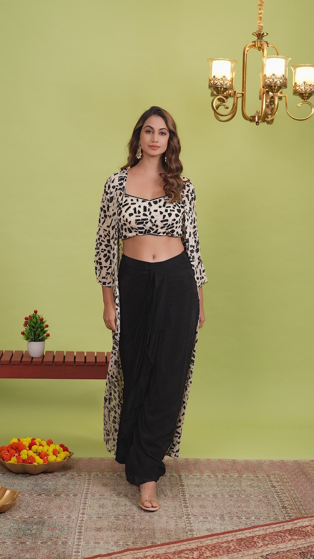 Step up your party game with this black & cream crop top, skirt, and shrug set. Perfect for a fun night out, this outfit is both stylish and comfortable. Get ready to turn heads and hit the dance floor!
